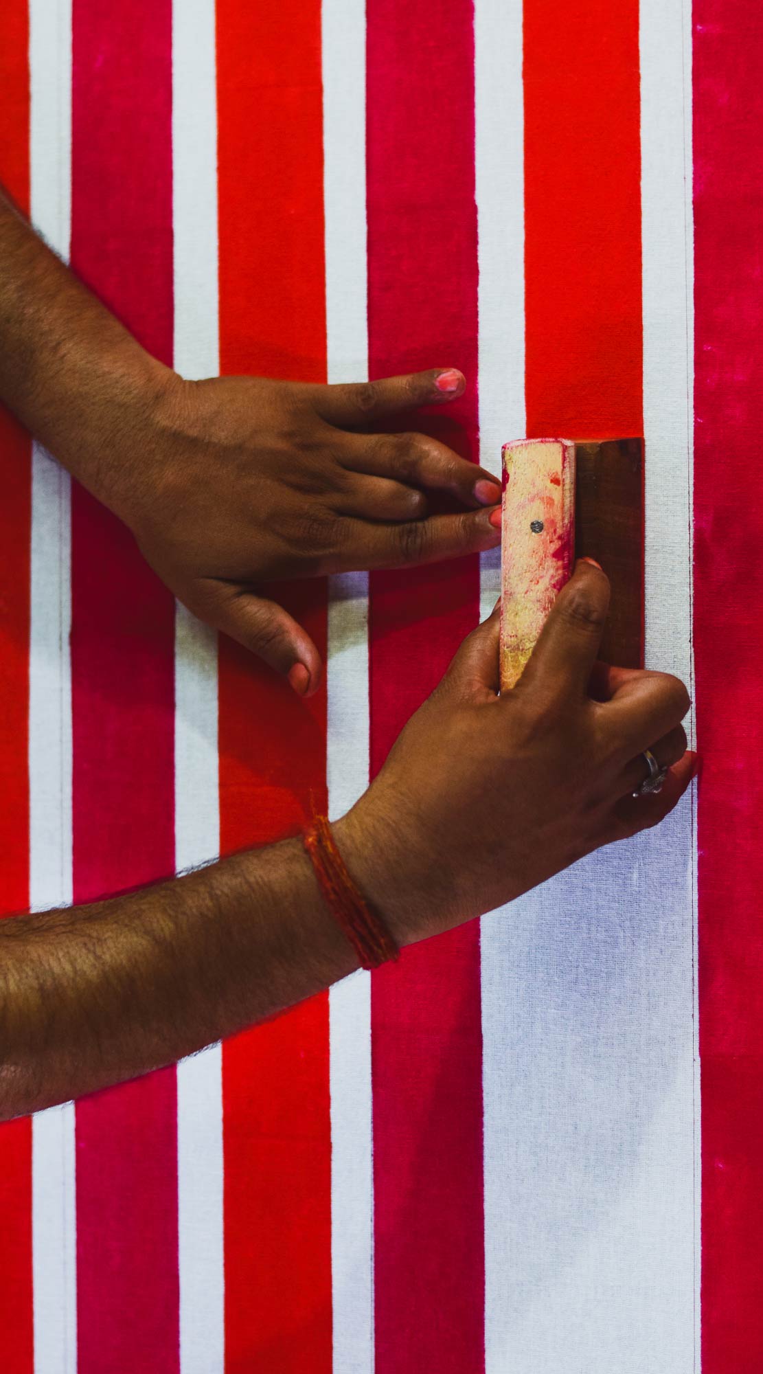 MRIGA KAPADIYA: We started our business in 2010. My good friend and business partner, Amrit, and I traveled to certain regions in India to learn more about textiles. We ended up in Kutch, Gujarat, in northern India. There, we found a library of indigenous tie-dyed textiles called Bandhani. We asked to meet the library’s founder, who introduced us to one of the families still keeping the art alive in that region. The Khatris are a sprawling family of around 50 tie-dye artisans. The men are the dyers, and the women are the tyers. Their tie-dyed fabrics were familiar to us because many of my mom’s shawls and sarees are made from that fabric. There was a specific fabric with tiny ties that fascinated us. We learned that the smaller the ties and the closer they are together, the more expensive the fabric is. It’s a status symbol, a representation of luxury.