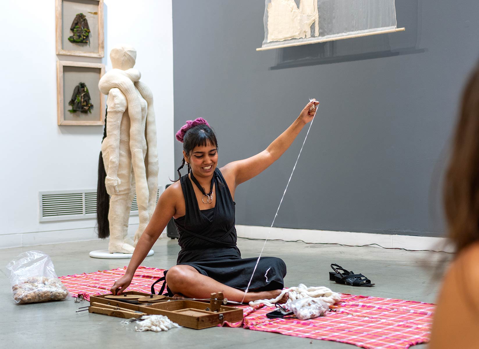 Shradha: I was so exhausted from having opened a solo show that I was facing burnout. And I’ve always made [things] in isolation. But I’ve also always hosted people. My studio transitions into a living space where we’re eating a meal, we’re talking about art, we’re making, questioning, brainstorming. My practice talks about self-reliance. The fact that I can take a seed and transform it into cloth is the most self-reliant thing I know how to do. So how do I make my own opportunities? One way was to bring people together.